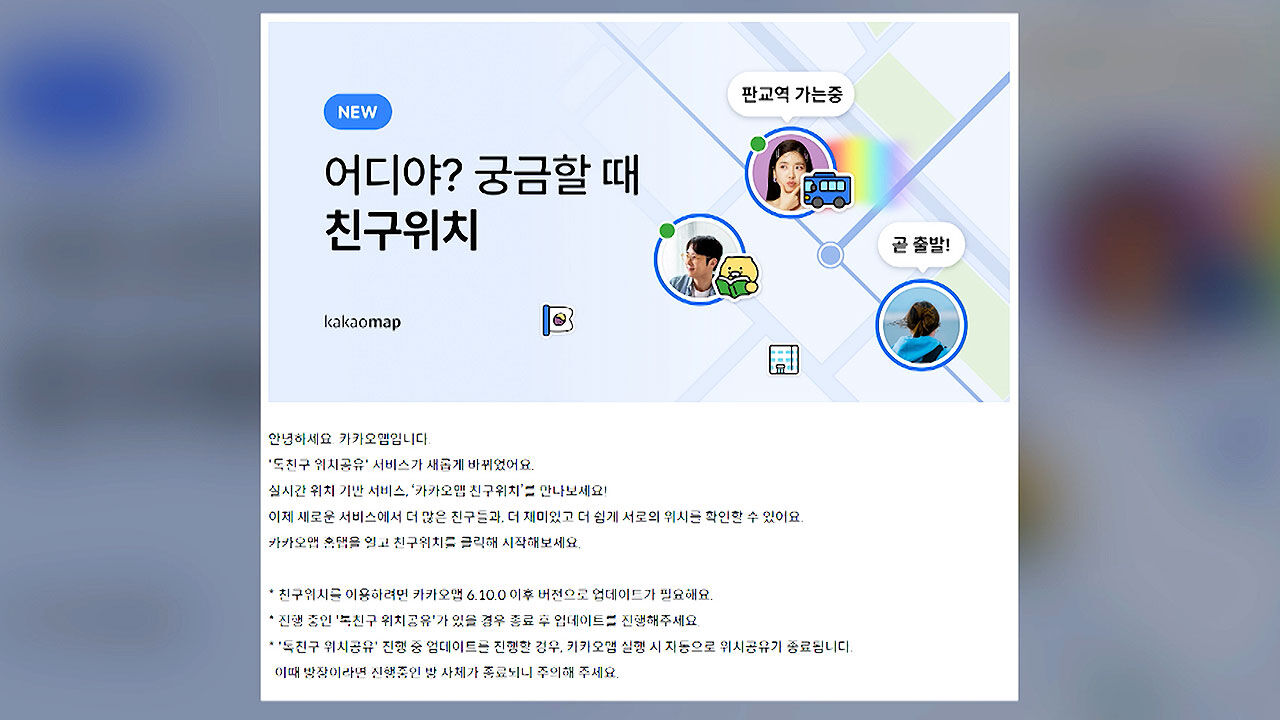 최근 카카오톡 친구 간의 위치를 공유할 수 있는 서비스가 확대됐거든요.