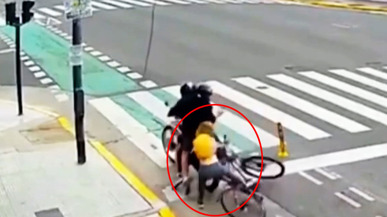 자전거를 타고 신호를 기다리던 여성의 뒤로 오토바이를 탄 두 남성이 슬그머니 다가옵니다.