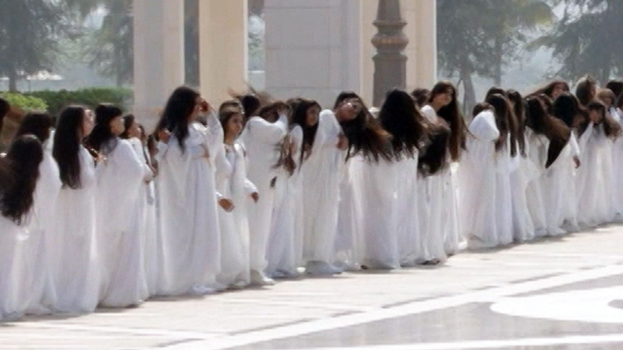 흰색 전통 복장을 입은 여성 들, 길게 줄지어 서서 긴 머리를 흔들고 있습니다.