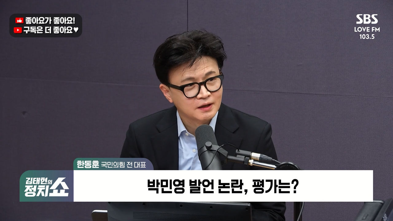 ▷김태현 : 알겠습니다. 나오신 김에 국민의힘 얘기 좀 하나 물어보죠. 박민영 미디어 대변인이 한 전 대표 머리 나쁘다던데. 머리에 뭐라고 그랬죠? 머리에 뭔 밭 이러면서 김예지 의원, 친한계로 불리는 김예지 의원을 비난하는 그 영상. 거기서 한 전 대표에 대한 비난도 좀 있었거든요. 이거 어떻게 들으셨어요?
