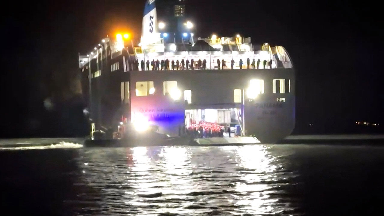 어두운 밤, 대형 여객선 앞머리가 작은 섬 위에 올라가 있습니다.