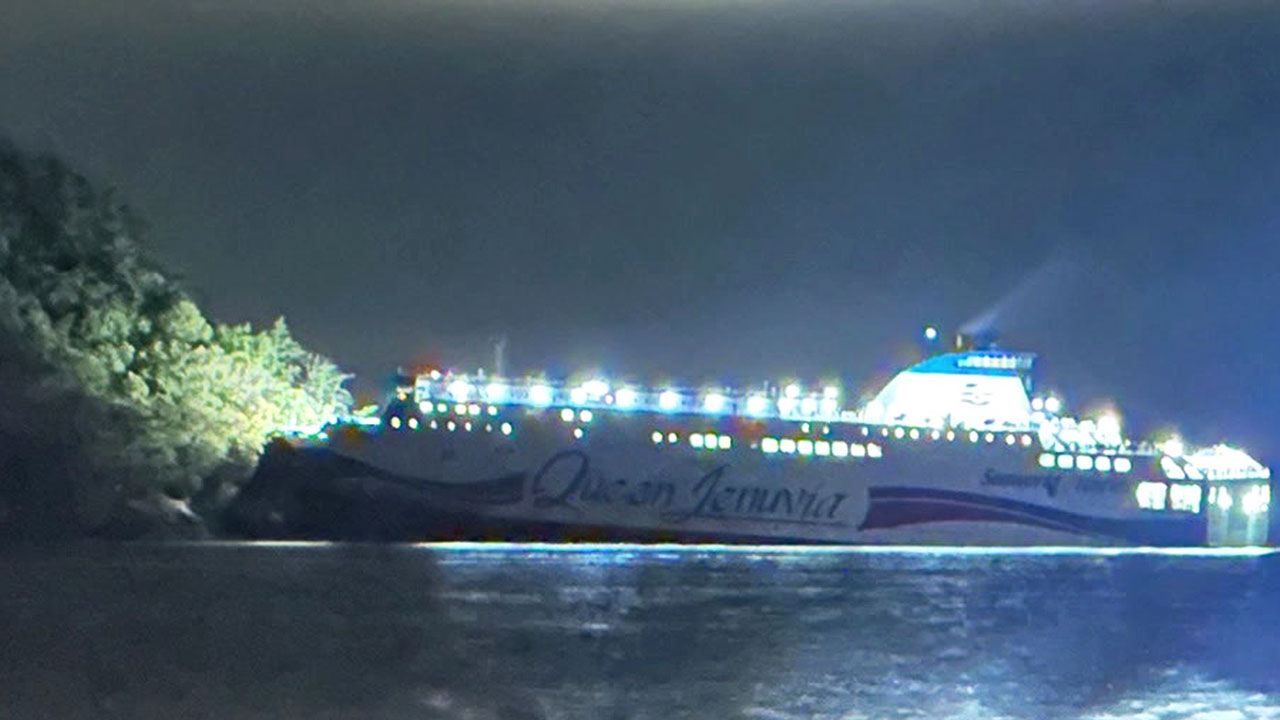 어두운 밤, 커다란 여객선 앞머리가 작은 섬 위에 올라가 있습니다.