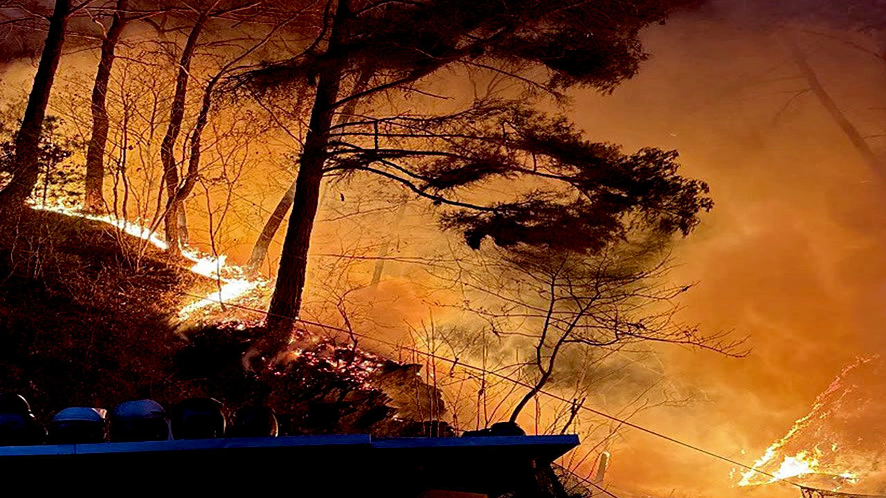 산 중턱에 붉은 화선이 생겼고, 곳곳에서 희뿌연 연기가 올라옵니다.