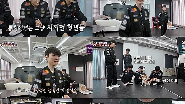 한편, T1 사무실에 간 K-똥개 룽지는 전설의 K-프로게이머 형님들과의 특별한 만남을 이어갔다. 평소 페이커에게 애교 폭발하던 룽지는 T1 선수단이 등장하자 갑자기 반응이 달라졌다. 페이커가 아무리 불러도 돌아보지 않고 숨기까지 해 현장을 웃음바다로 만들었다. 페이커는 "시커먼 청년들이 있어서 안 온다"며 억울함을 토로했고, 선수단은 룽지의 등을 '마우스 광클'하듯 만지며 다정한 손길과 간식으로 애정을 표현했다.