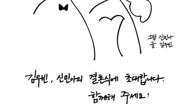 공개된 청첩장은 "김우빈, 신민아의 결혼식에 초대합니다. 함께해 주세요"라는 손 글씨와 함께 직접 그린 듯한 그림 이미지로 시선을 사로잡았다. 하단에는 그림 신민아, 글 김우빈이라고 쓰여있었다. 김우빈이 손 글씨를 쓰고, 신민아가 손 그림으로 만든 청첩장임을 알 수 있었다.