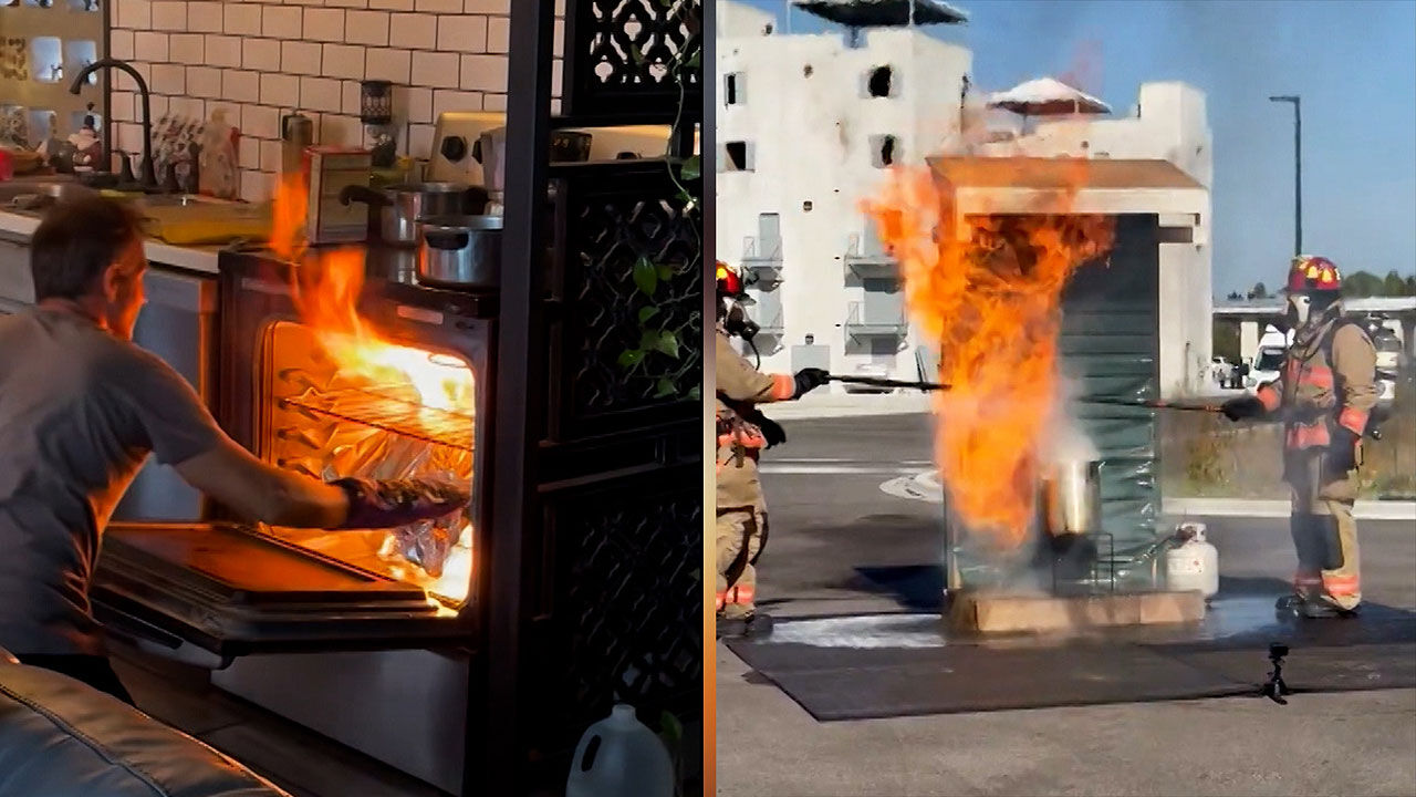 보호장비를 갖춘 소방대원들이 냉동 칠면조를 끓는 기름에 집어넣자 곧 시뻘건 불길이 치솟습니다.