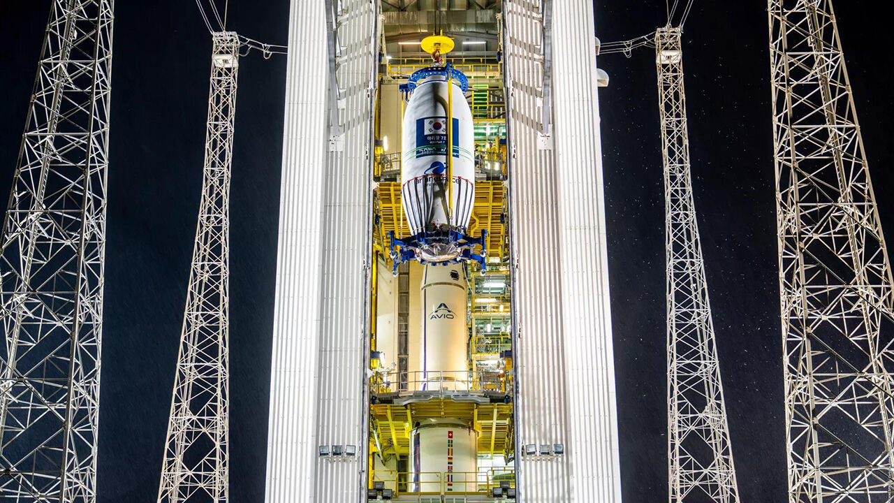 ▲ 기아나 우주센터에서 발사 전 기립해 있는 베가C에 실린 아리랑 7호