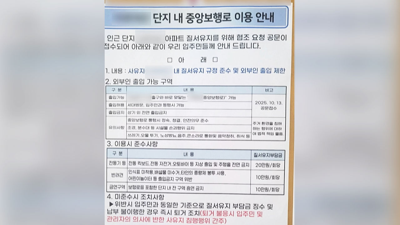 중앙 보행로를 제외한 모든 구역에 외부인 출입을 금지하고, 어린이 놀이터 출입은 10만 원, 전동킥보드와 전동자전거 주행에는 20만 원의 위반금을 부과한다는 것입니다.