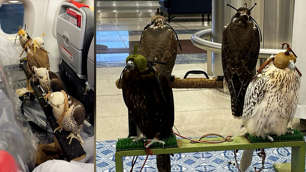 비행기 안에 머리에 후드를 쓴 매 4마리가 좌석 한 줄을 통째로 차지하고 앉아 있습니다.