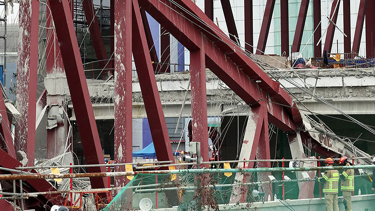 트러스와 기둥 연결이 용접 과정으로만 이뤄졌는데, 무게를 버티지 못하고 접합부가 끊어졌을 가능성이 있습니다.