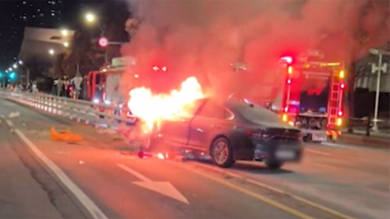 왕복 8차선 도로 한복판에서 승용차 한 대가 불길에 휩싸인 채 중앙선 위에 걸쳐 멈춰 서 있습니다.