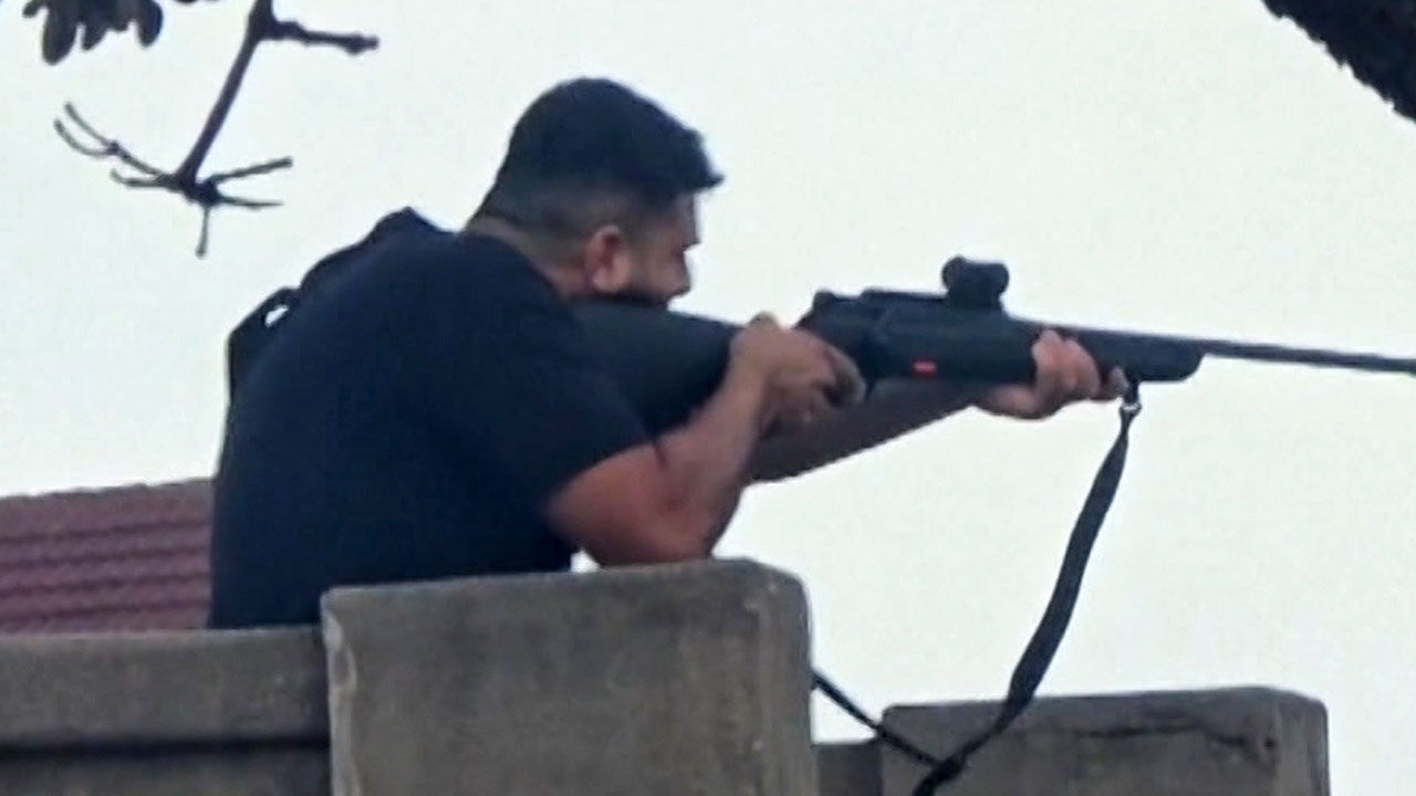 검은 옷을 입은 남성이 다리 위에서 총격을 가합니다.