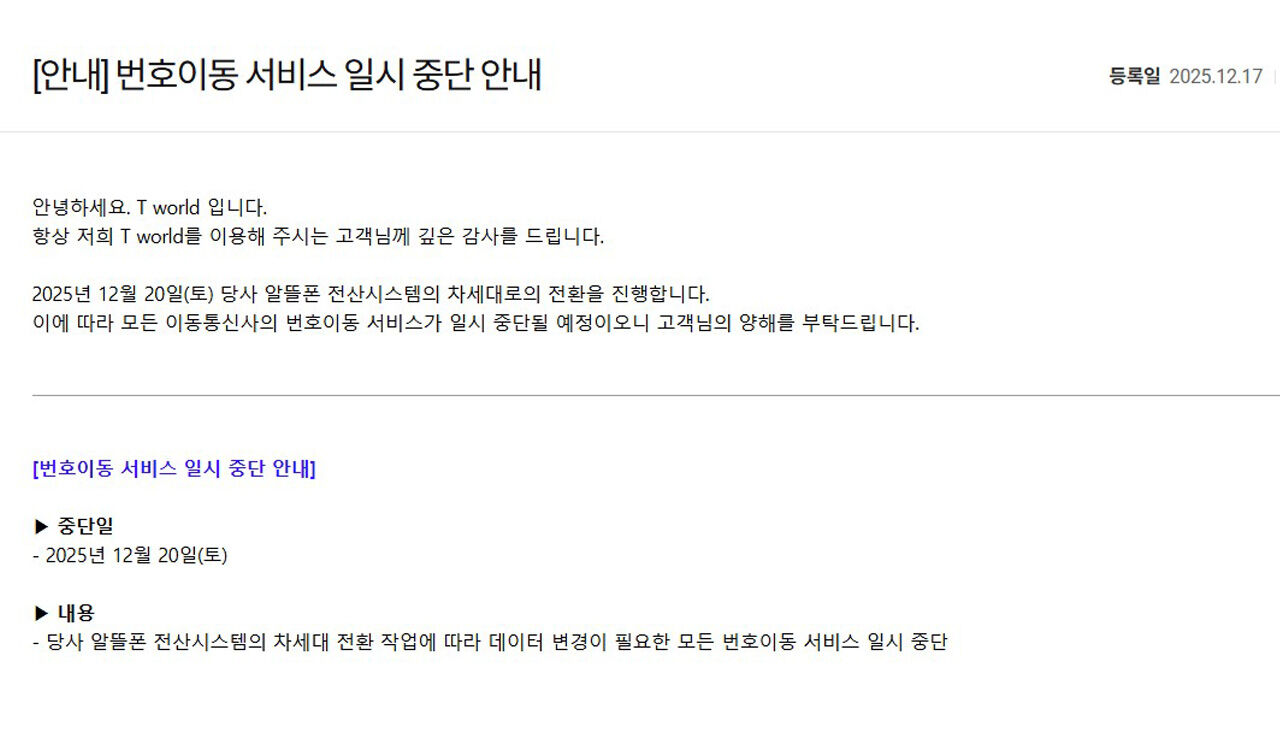 오늘(17일) 통신업계에 따르면 한국통신사업자연합회(KTOA)는 SK텔레콤이 20일 알뜰폰 전용 차세대 전산 시스템 업그레이드 작업을 진행함에 따라 해당 날짜를 임시 휴무일로 지정했습니다.