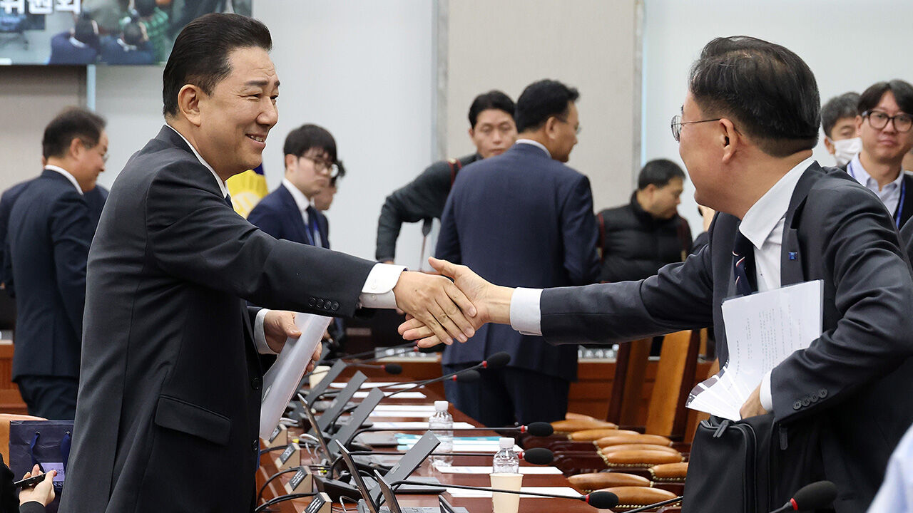 ▲ 김병기 위원장(왼쪽)과 조국혁신당 신장식 의원이 18일 국회에서 열린 운영위원회 전체회의에서 악수를 나누고 있다