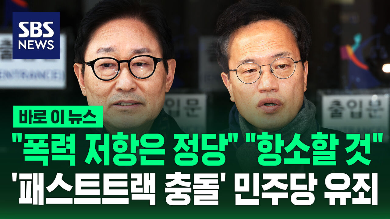 2019년 검찰개혁 법안을 패스트트랙으로 지정하는 과정에서 자유한국당 당직자들을 폭행한 혐의를 받는 더불어민주당 전·현직 의원들이 전원 벌금형을 선고받았습니다. 서울남부지법은 박범계, 박주민 민주당 의원에게 각각 벌금 300만 원을 선고하고 이를 유예했습니다. 김병욱 대통령실 정무비서관은 벌금 1000만 원, 이종걸 전 의원은 500만 원을 선고받았고, 표창원 전 의원은 벌금 300만 을 선고유예 받았습니다. 재판부는 폭력행위가 정당화될 수 없다면서도 이 사건이 한국당 관계자들의 국회 봉쇄로 국회 기능이 마비되는 특수한 의정환경 속에서 불가피하게 촉발된 점을 고려했다고 설명했습니다. 선고가 끝난 뒤 법정에서 나온 박범계, 박주민 의원의 발언을 영상으로 전해드립니다.