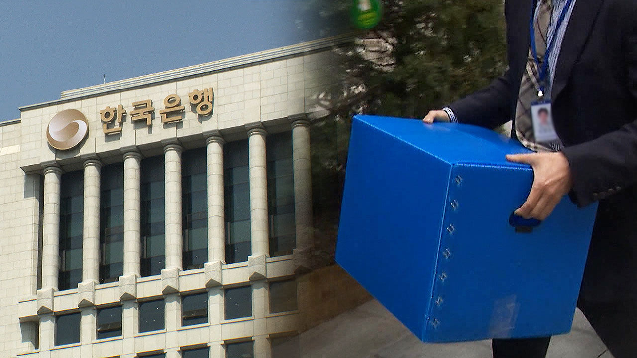파란색 상자를 든 수사관들이 한국은행으로 들어갑니다.