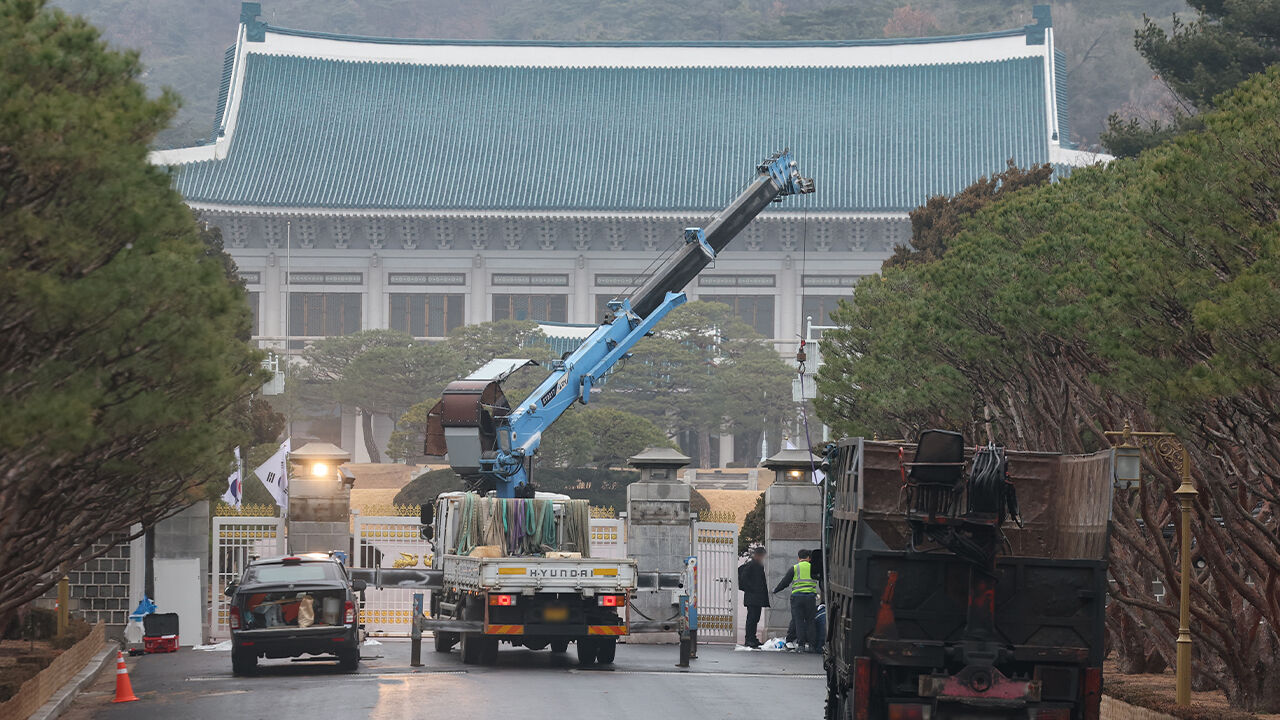 ▲ 20일 서울 종로구 청와대 앞에서 관계자들이 크레인 차량으로 작업을 하고 있다. 대통령실은 이번 달 말까지 청와대 이주를 마칠 예정이다.