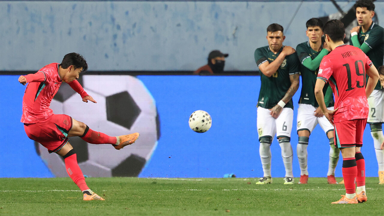 ▲ 지난 11월 대전월드컵경기장에서 열린 남자축구 국가대표 평가전 대한민국 대 볼리비아의 경기에서 손흥민이 프리킥으로 선제골을 넣고 있다,