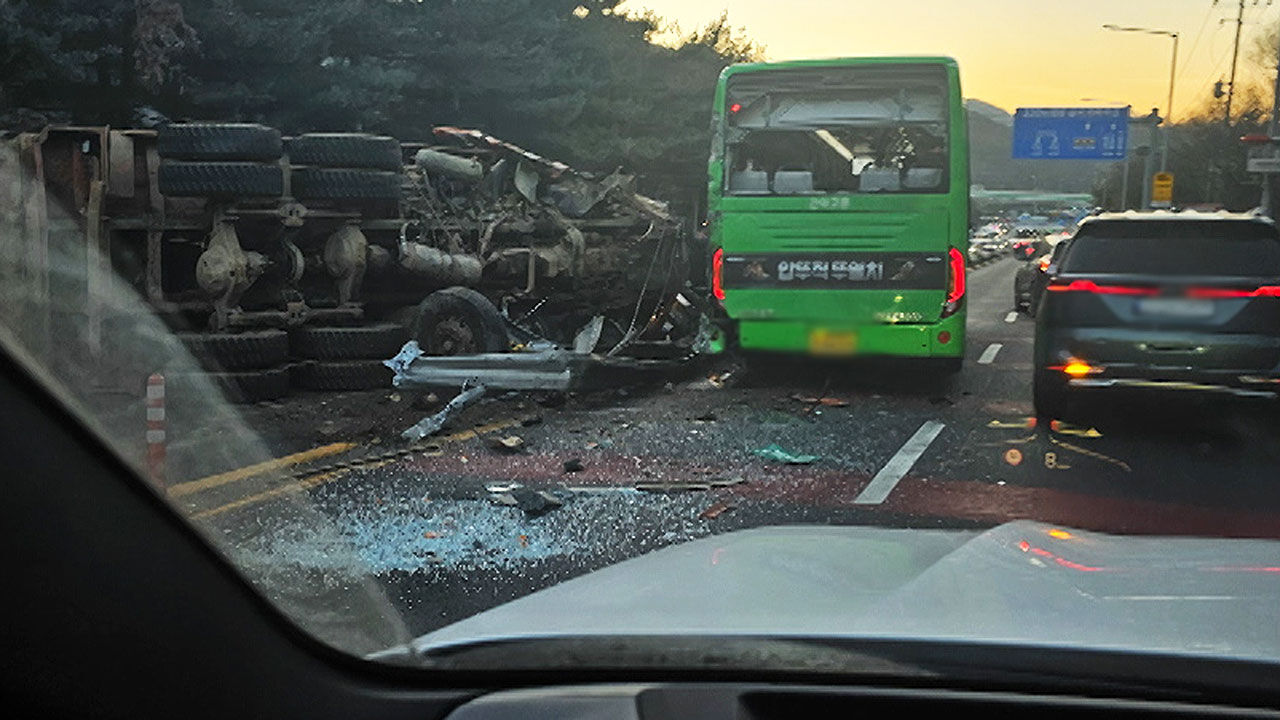 또 사고 충격으로 화물차가 옆으로 넘어지면서 차량에 적재돼있던 흙이 도로 위로 쏟아져 한때 정체가 빚어졌습니다.