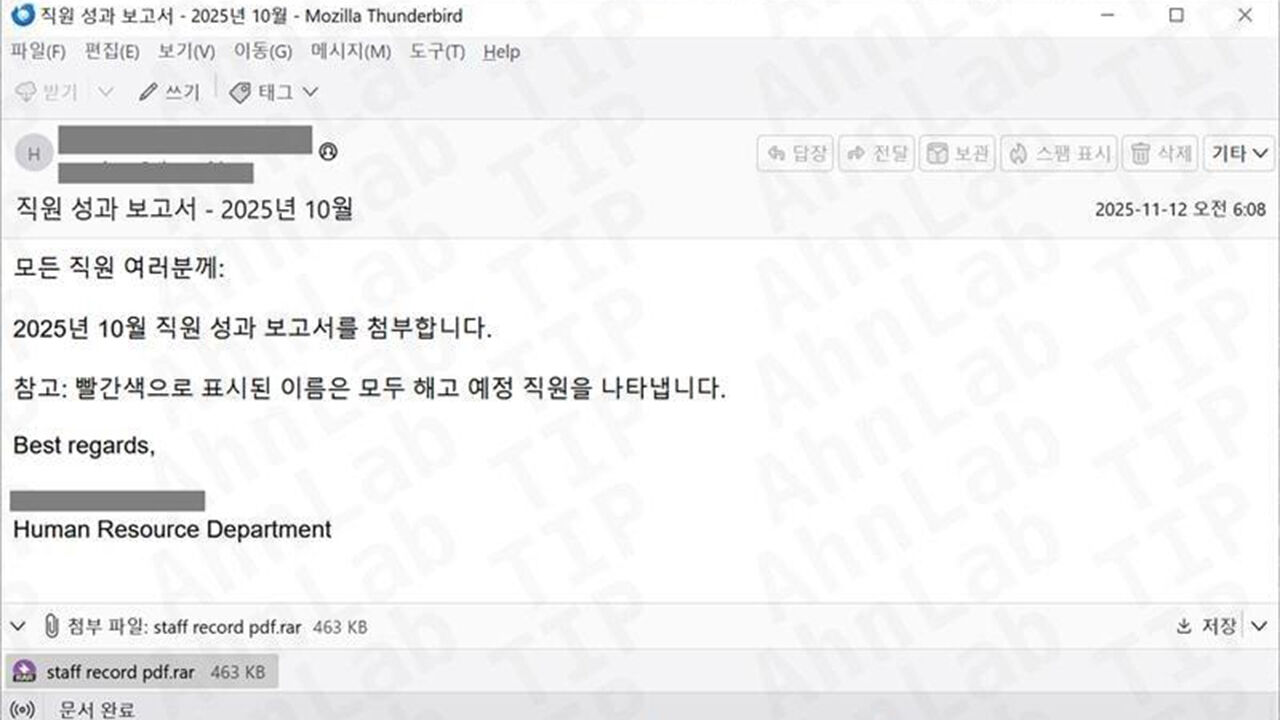 안랩에 따르면 공격자는 기업 인사팀을 사칭해 '직원 성과 보고서'라는 제목의 메일을 발송했습니다.