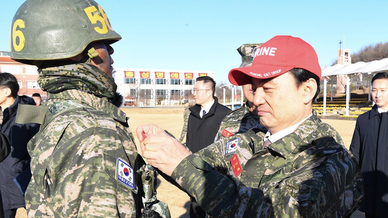 ▲ 안규백 국방부 장관이 신병 극기주 훈련을 마친 해병 1324기 훈련병에게 빨간 명찰을 친수하고 있다.