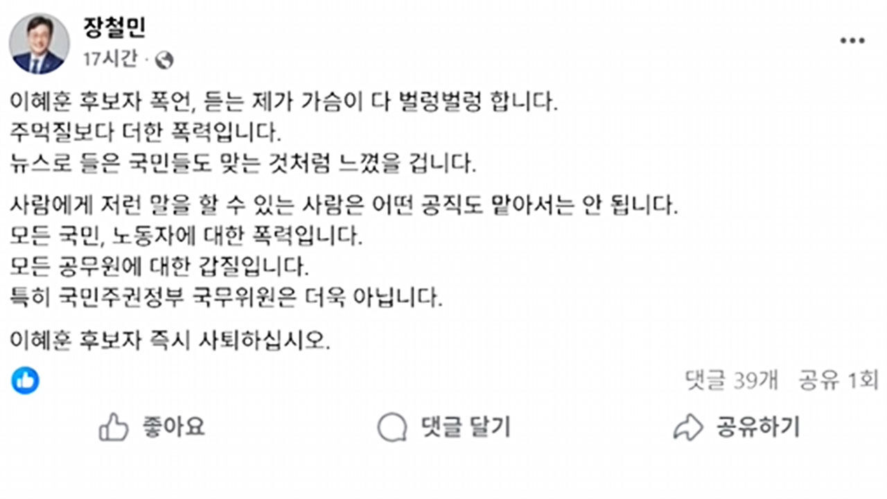 재선인 장철민 의원은 오늘(2일) 페이스북에 글을 올려 "사람에게 저런 말을 할 수 있는 사람은 어떤 공직도 맡아선 안 된다"며 "이 후보자는 즉시 사퇴하라"고 촉구했습니다.