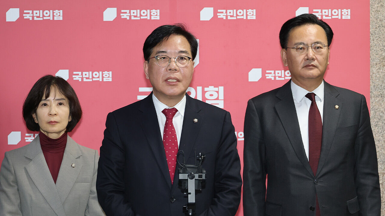 ▲ 본회의 개최 두고 입장 밝히는 송언석 원내대표 (왼쪽부터 최수진 원내수석대변인, 송 원내대표, 유상범 원내운영수석부대표.)