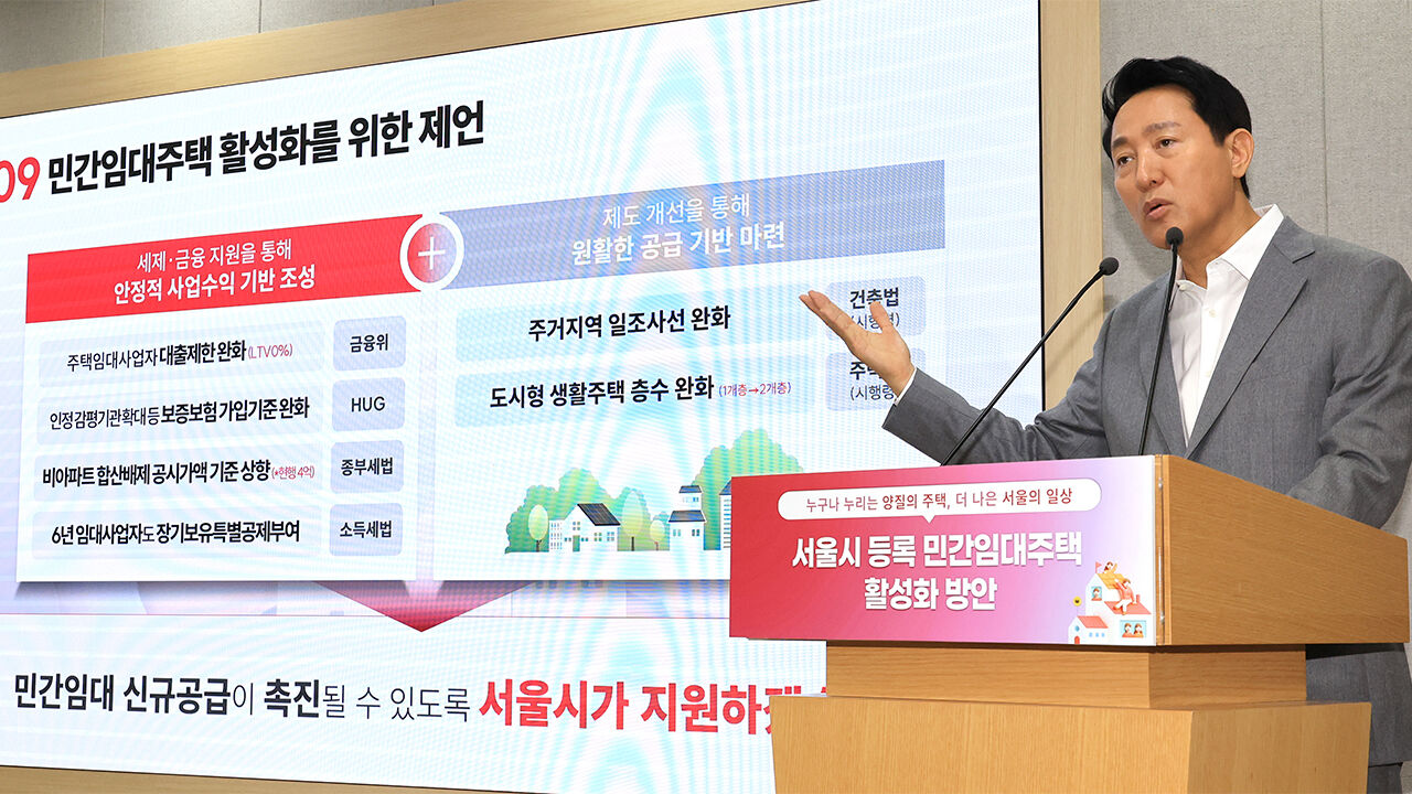이 자리에서 오 시장은 "민간임대사업자 규제 강화는 거주 안정성이 높은 민간임대주택 공급 감소로 이어져 전월세 서민 주거 불안을 높이고, 비아파트 공급물량이 감소하는 심각한 부작용을 초래하고 있다"고 지적했습니다.