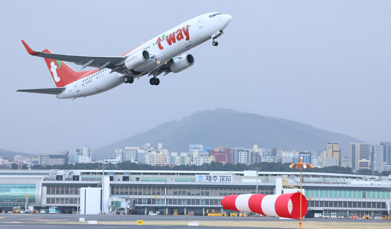 ▲ 제주공항 활주로에서 강풍을 뚫고 항공기가 이륙하는 모습
