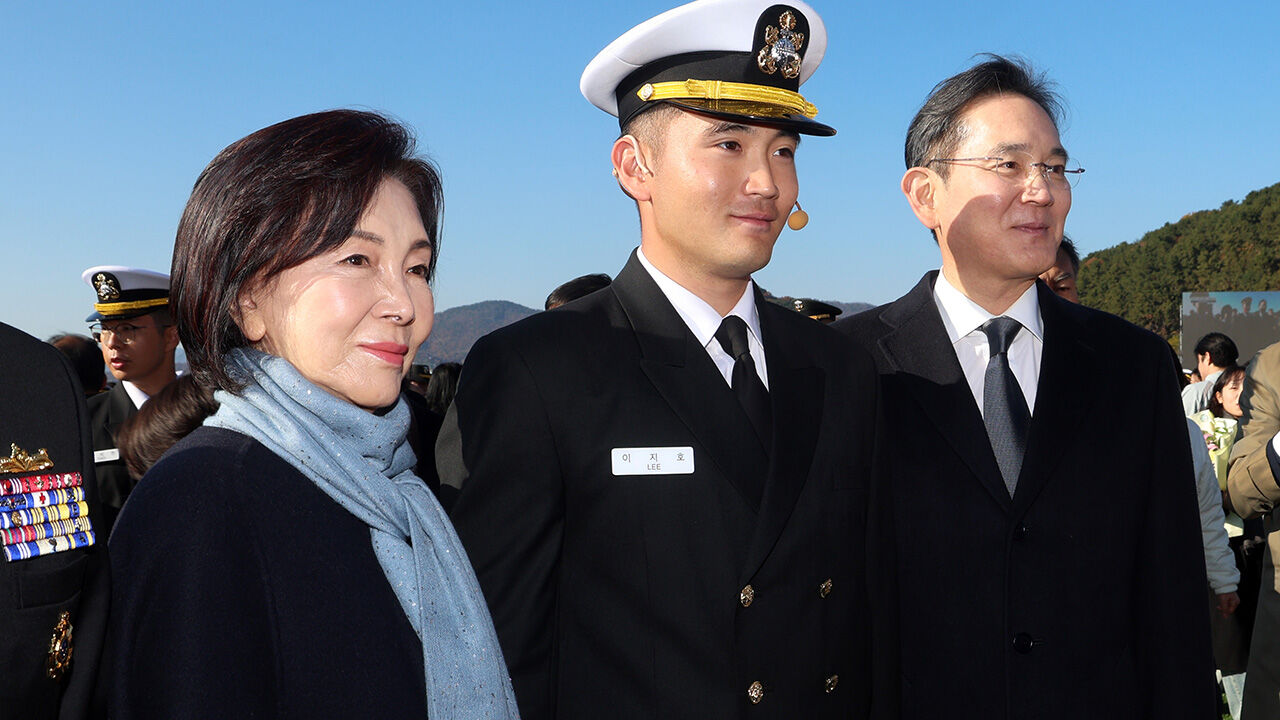 ▲ 지난해 11월 28일 오후 경남 창원시 진해구 해군사관학교 연병장에서 열린 제139기 해군·해병대 사관후보생 수료 및 임관식에서 이재용 삼성전자 회장과 홍라희 리움미술관 명예관장이 이지호 신임 소위와 기념 촬영하고 있다.