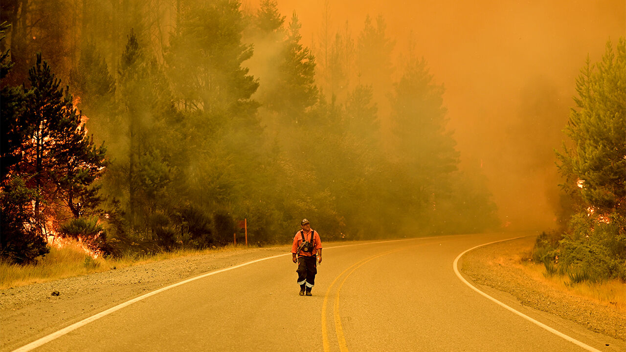 ▲ 현지시간 8일 아르헨티나에서 산불이 타오르는 가운데 소방관이 도로를 걷고 있다.