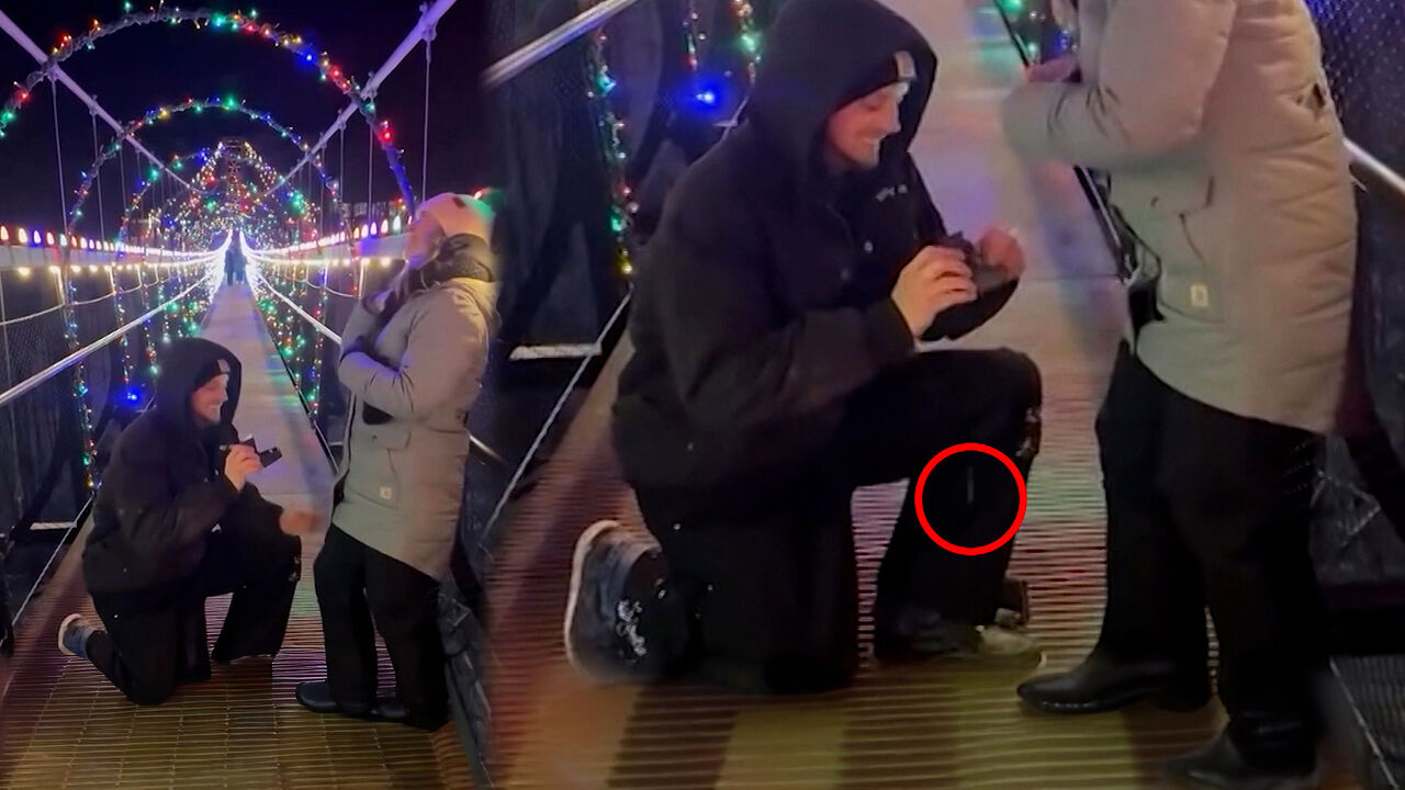 미국 미시간주의 한 스키 리조트에서 한 남성이 무릎을 꿇고 청혼을 하고 있습니다.