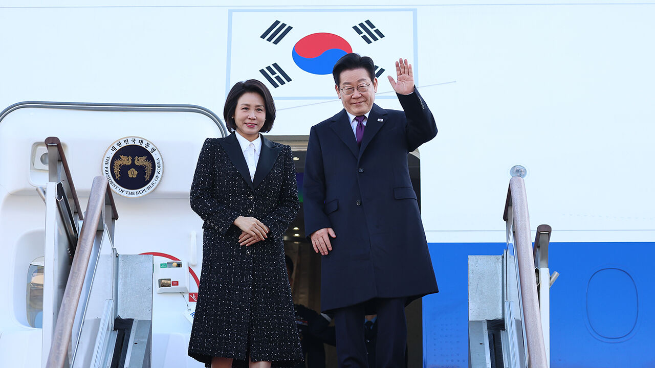 ▲ 한일 정상회담을 위해 일본 나라현을 방문하는 이재명 대통령과 김혜경 여사가 13일 성남 서울공항 공군 1호기에서 환송객에게 인사하고 있다.