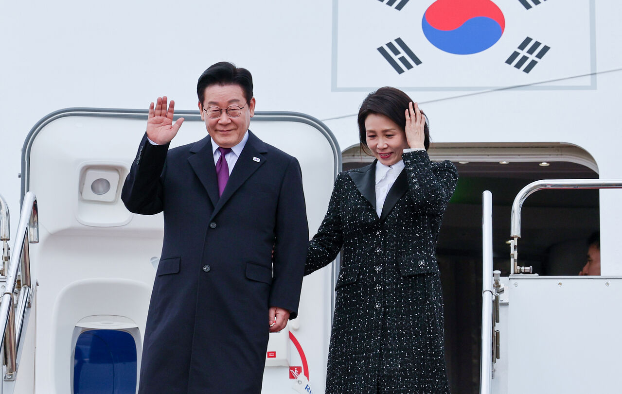 ▲ 이재명 대통령과 김혜경 여사가 13일 일본 오사카 간사이국제공항에 도착한 공군 1호기에서 환영객에게 인사하고 있다.