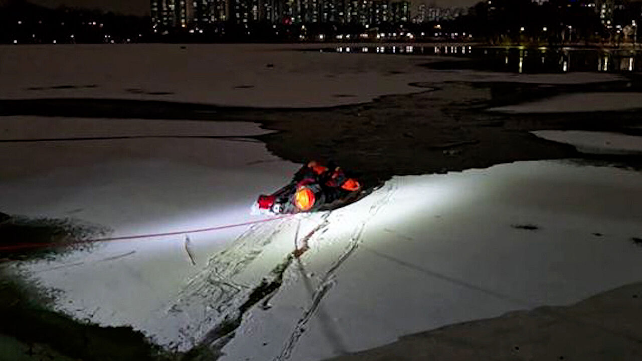 50대 남성이 얼어붙은 저수지를 지름길이라고 생각하고 건너다 물에 빠졌습니다.