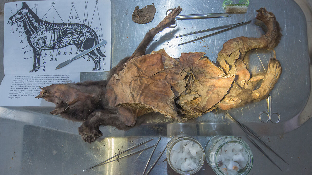▲ 뱃속에서 털코뿔소 조직 조각이 나온 빙하기 늑대 새끼(Tumat-1)