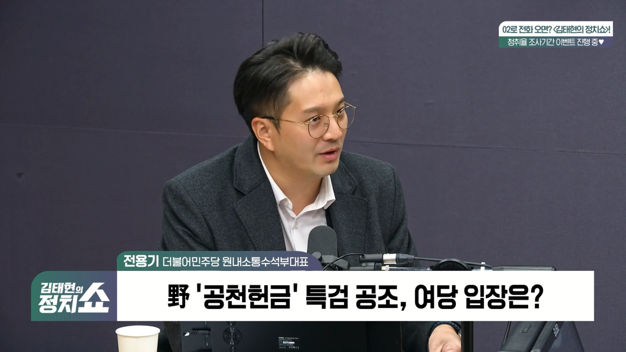 ▶전용기 : 실제로 늦었던 것으로 보고 있습니다. 그래서 국민의힘에서는 특검하자고 주장을 하는데요. 과거 통일교 특검처럼 수사대상이 민주당으로만 돼야 된다, 그렇게 한정돼야 된다라고 하는 말도 안 되는 주장만 되풀이할 거라면 받을 수 없다라는 입장입니다. 저희는 기본적으로 공천헌금과 관련해서는 과거부터 지금까지 있었던 정치권의 병폐 아닙니까. 이거는 반드시 이번에 끊어내고 가야 된다라고 하는 측면에서 특검을 한다면 여야 할 것 없이 모두 이런 의혹들을 가지고 있는 사람들은 싹 수사하고 털고 나가야 된다라고 하는 측면에서는 공감한다라는 말씀드리겠습니다.