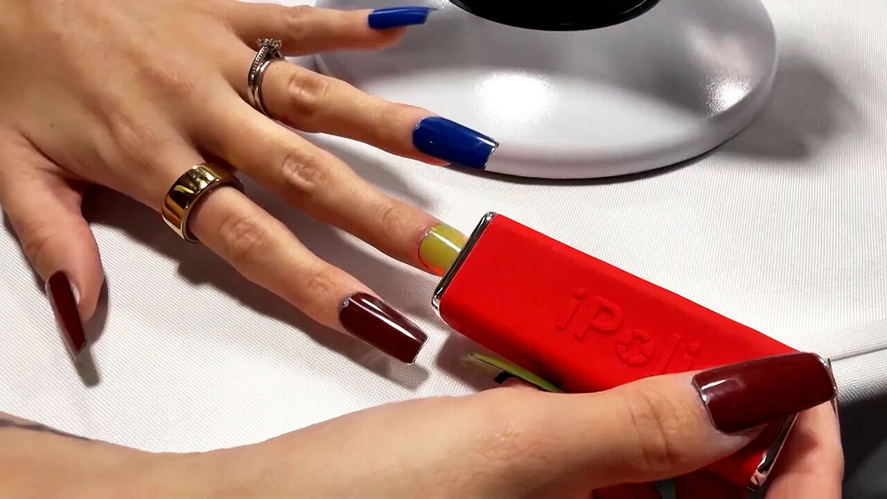 립스틱처럼 생긴 변환기와 스마트폰을 블루투스로 연결한 뒤 손가락을 살포시 집어넣자 단 5초 만에 손톱 색깔이 바뀝니다.