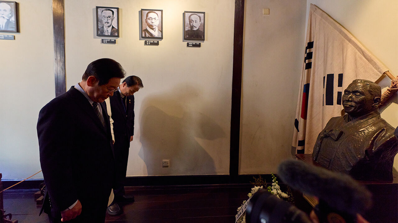 ▲ 이재명 대통령과 권오을 국가보훈부 장관이 지난 7일 중국 상하이 대한민국 임시정부 유적지를 방문해 김구 선생 흉상에 헌화 뒤 묵념하고 있다.