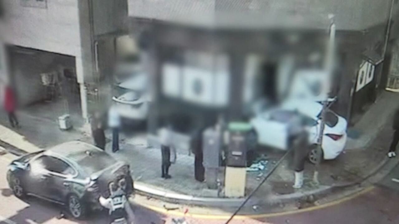 흰색 승용차 차체가 1층 건물 내부로 들어가 있고, 도로에는 후미가 파손된 승용차와 파편이 널브러져 있습니다.