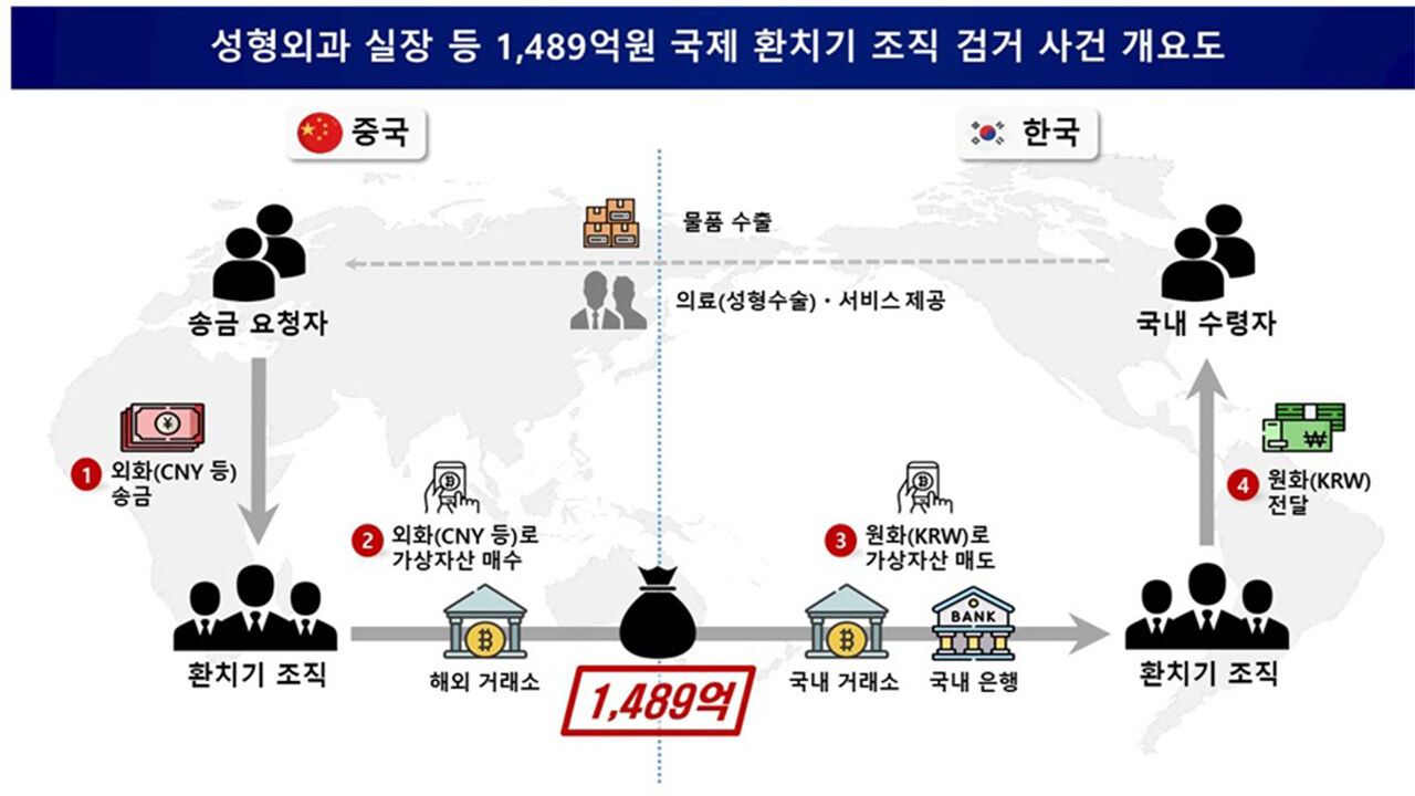 이들은 2021년 9월부터 작년 6월까지 국내외 가상자산 계정과 국내 은행 계좌를 다수 개설하고 외국인 성형수술 비용과 수출입 무역대금, 면세품 구매 대금, 유학생 유학자금 등 총 1천489억 원 상당의 자금을 불법으로 환치기한 혐의를 받습니다.