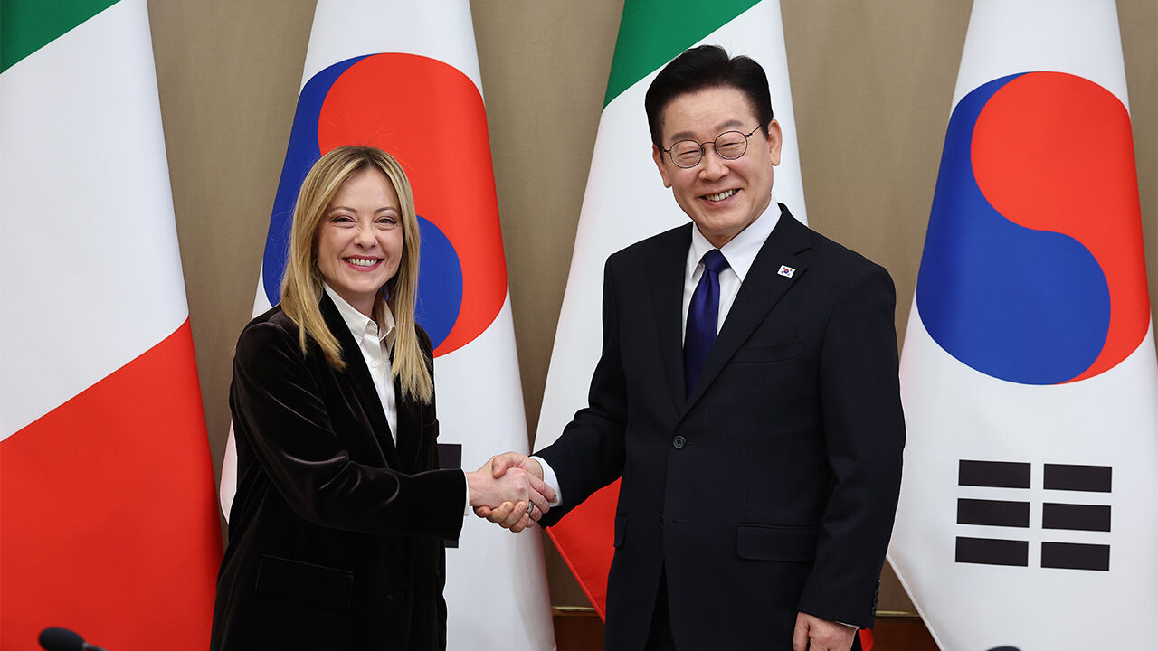 ▲ 이재명 대통령과 조르자 멜로니 이탈리아 총리가 19일 청와대에서 열린 확대회담에서 악수하고 있다.