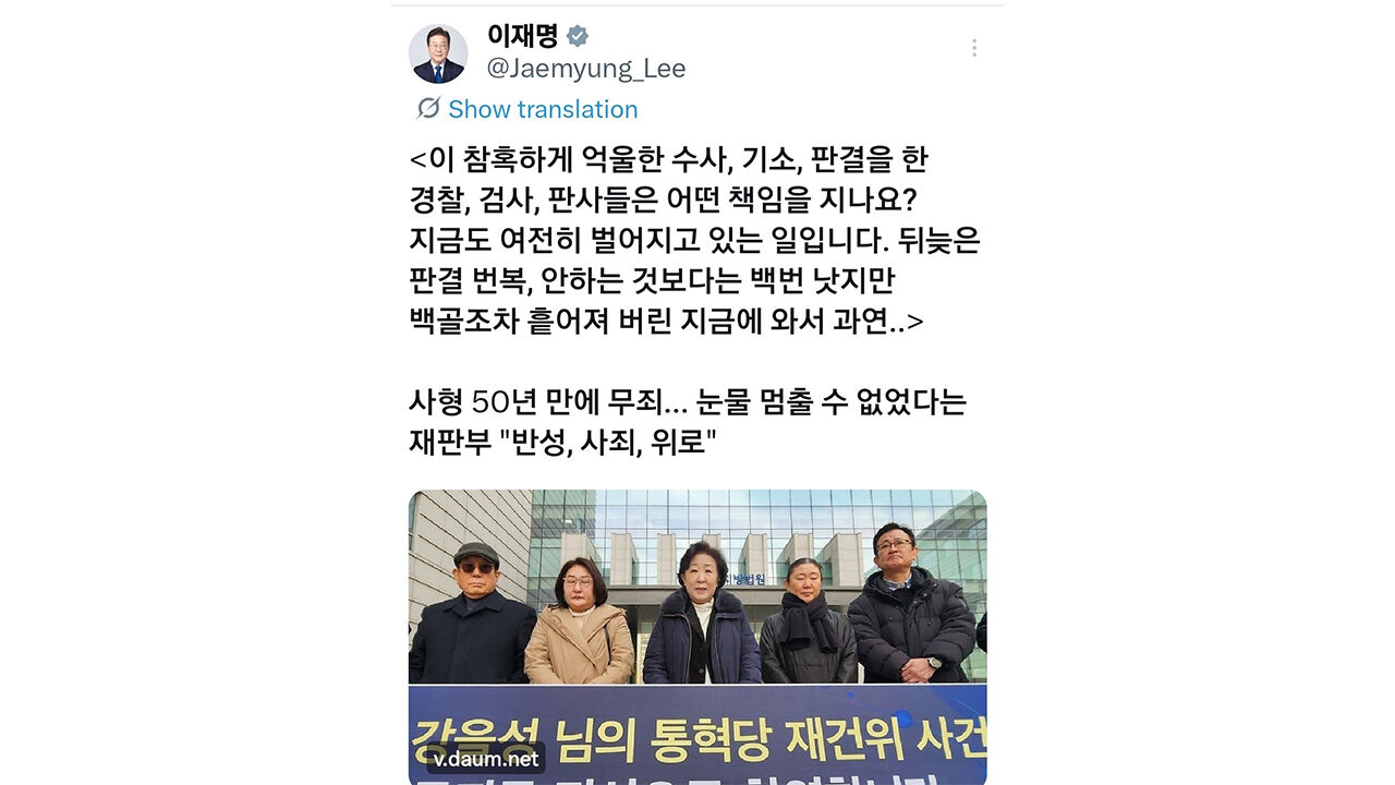 이 대통령은 이날 엑스(X·옛 트위터)에 관련 기사를 공유한 뒤 참혹하게 억울한 방식으로 수사, 기소, 판결이 이뤄진 것이라며 이같이 언급했습니다.