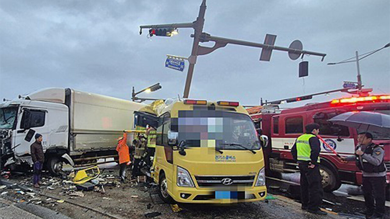 ▲ 지난달 23일 오후 전북 김제시 공덕면 존걸교차로 인근에서 화물차와 인근 초등학교 통학 차량이 충돌해 학생들 여러 명이 다쳤다.