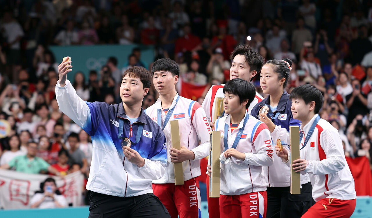 ▲ 2024년 7월 30일, 한국 임종훈, 신유빈과 북한 리정식, 김금영 등이 시상대에서 삼성 Z플립 6로 함께 기념 촬영을 하고 있다.