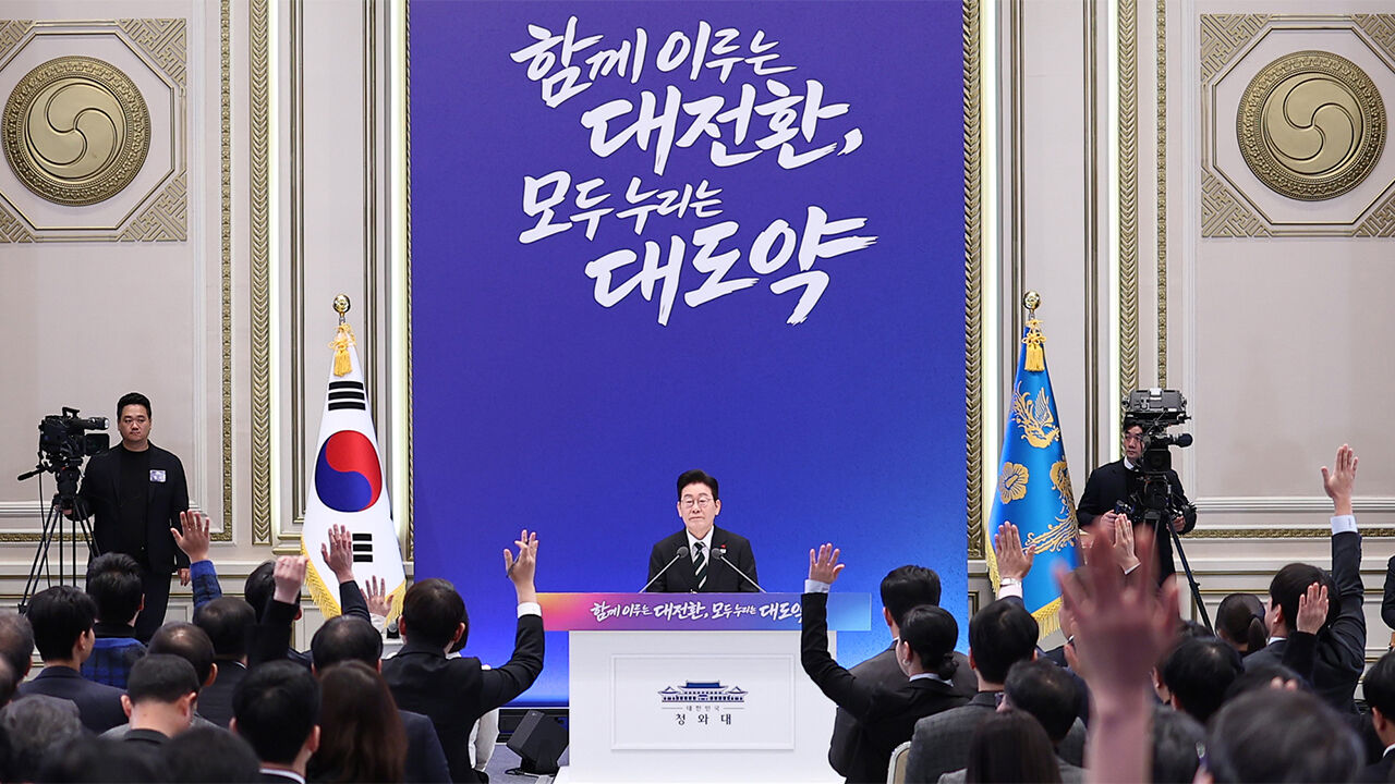 ▲ 이재명 대통령이 21일 청와대 영빈관에서 열린 신년기자회견에서 취재진 질문을 받고 있다.
