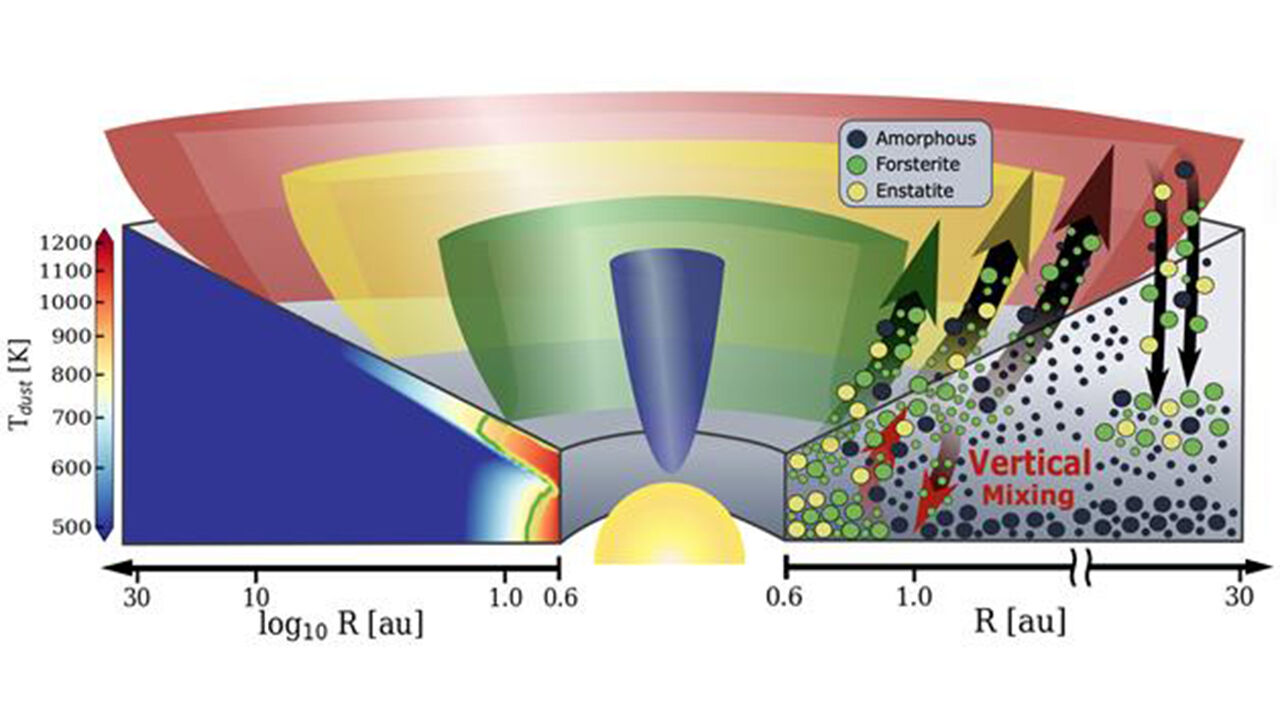이 원반풍이 고온 내부 원반 표면에서 만들어진 결정질 규산염을 들어 올려 차가운 원반 외곽으로 운반할 수 있는 물리적 경로를 제공한다고 해석한 것입니다.