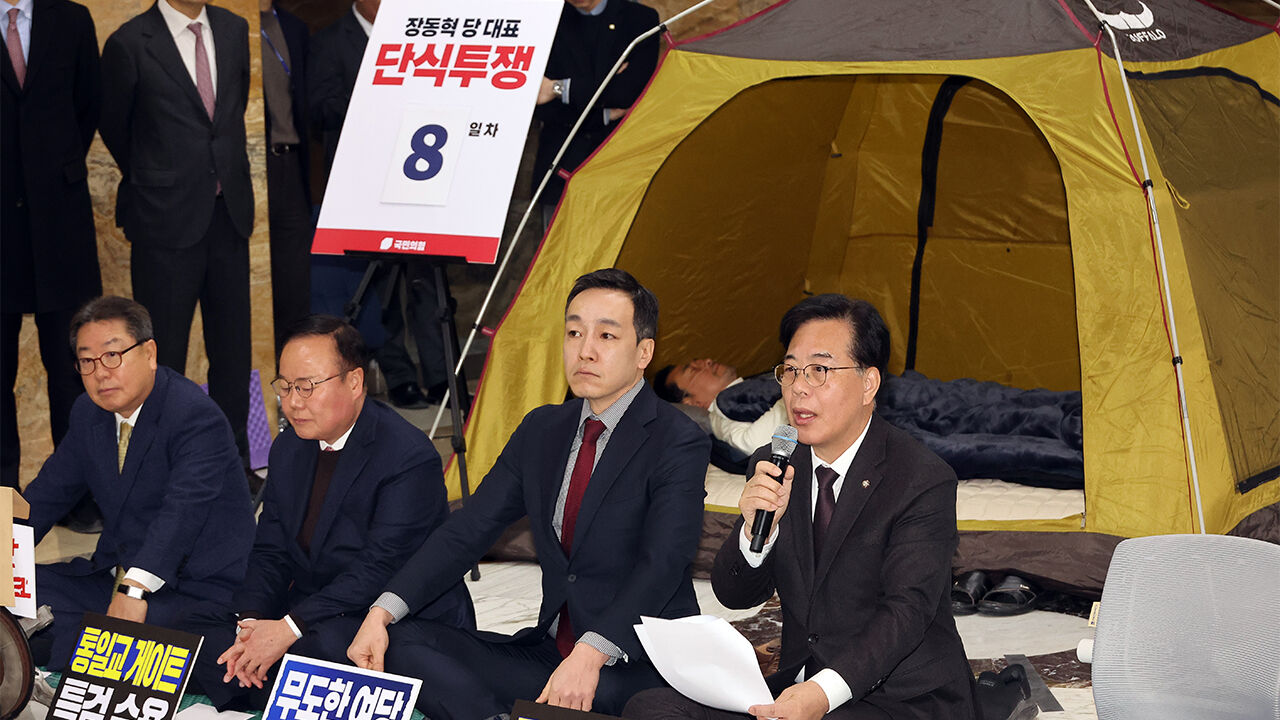 ▲ 통일교·공천헌금 '쌍특검' 입법을 요구하며 단식 투쟁에 나선 지 8일 차를 맞은 국민의힘 장동혁 대표가 22일 국회 로텐더홀 텐트 안에 누워있는 동안 최고위원회의가 열리고 있다.