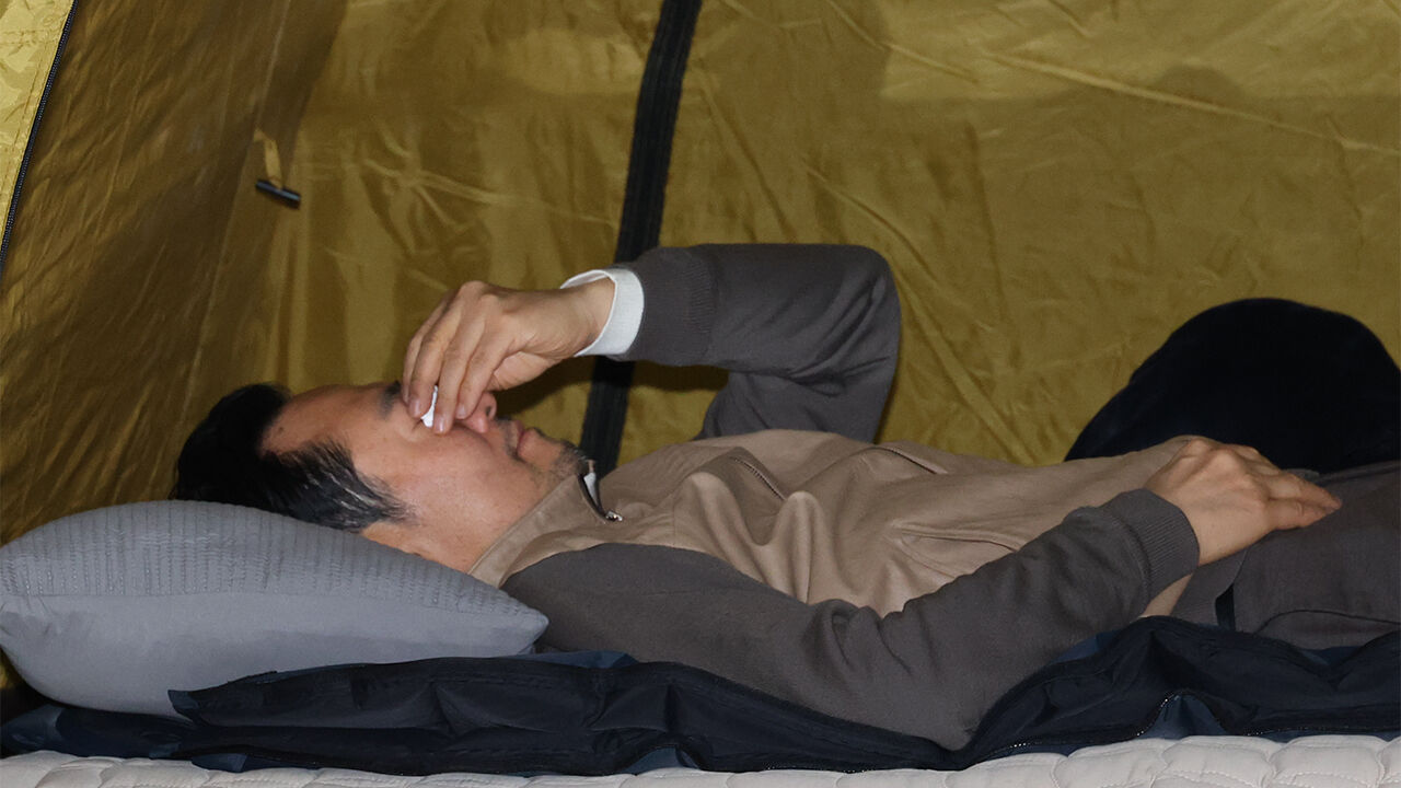 ▲ 국민의힘 장동혁 대표가 22일 서울 여의도 국회 로텐더홀 단식 농성장에 마련된 텐트 안에 누워 있다.