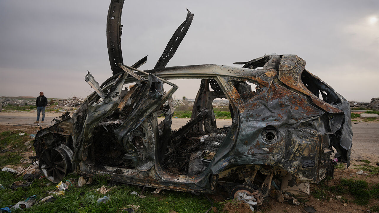 ▲ 팔레스타인인 기자 3명이 탑승했던 차량이 21일(현지시간) 이스라엘군 공격으로 불탄 모습.